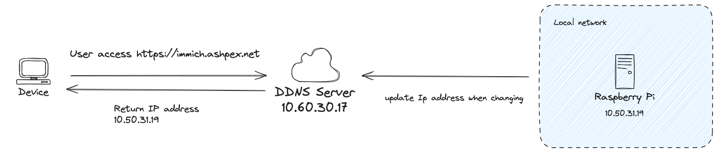 - Install a DDNS client on my Pi that periodically checks my public IP address and updates the DNS records of my domain name (immich.ashpex.net).