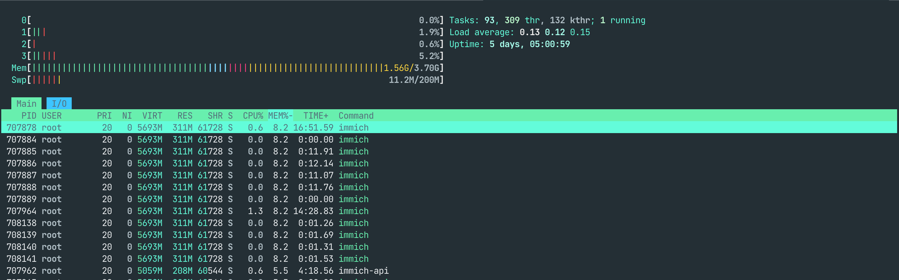 Looking pretty good with the ram consumption and cpu usage (if barly any usage at all). Immich takes up 500 MB of RAM, the remaining RAM consumption is taken by my Seafile server.