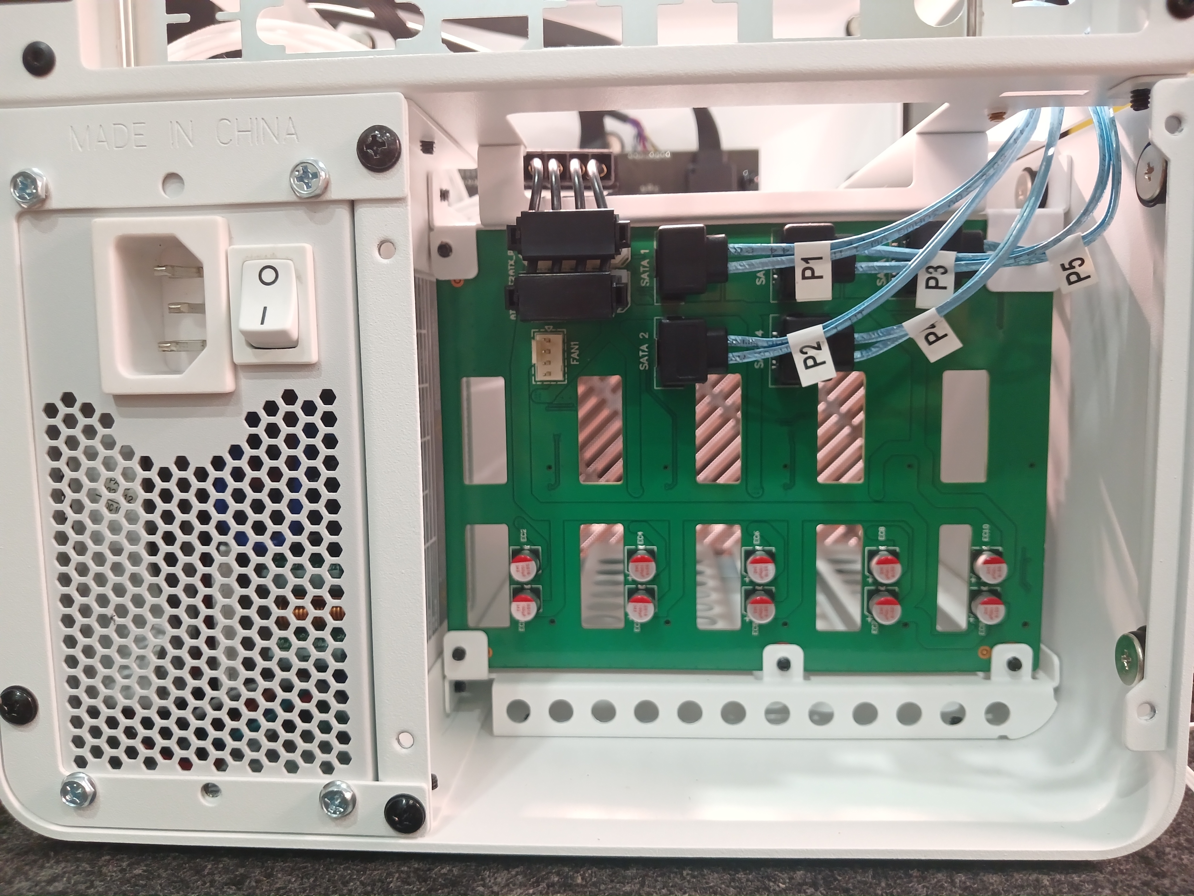 The case comes with a 15mm slim fan, which is a drawback because it lacks the static pressure needed to effectively cool the drives. Fortunately, I was able to replace it with a 25mm Arctic P12 PWM fan by using this Molex adapter and right-angled SATA cables. These modifications provided the necessary clearance to fit the larger fan comfortably, improving airflow and cooling performance.