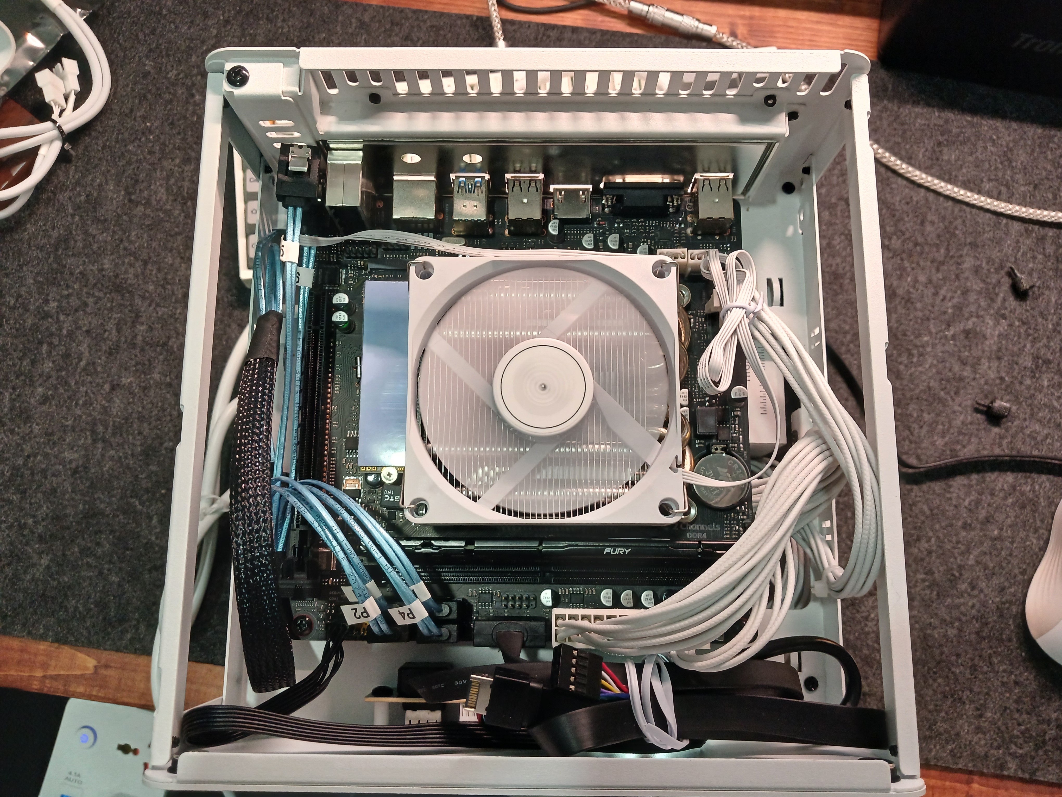 There are not many options for mITX motherboards, especially if you want one with an LGA1151 socket. But I manage to get my hands on a chinese motherboard, the Panshi B250 ITX. It has 4 SATA ports, 2 RAM slots, and a M.2 slot. The CPU is an Intel i5 6500, which is more than enough for a NAS server.